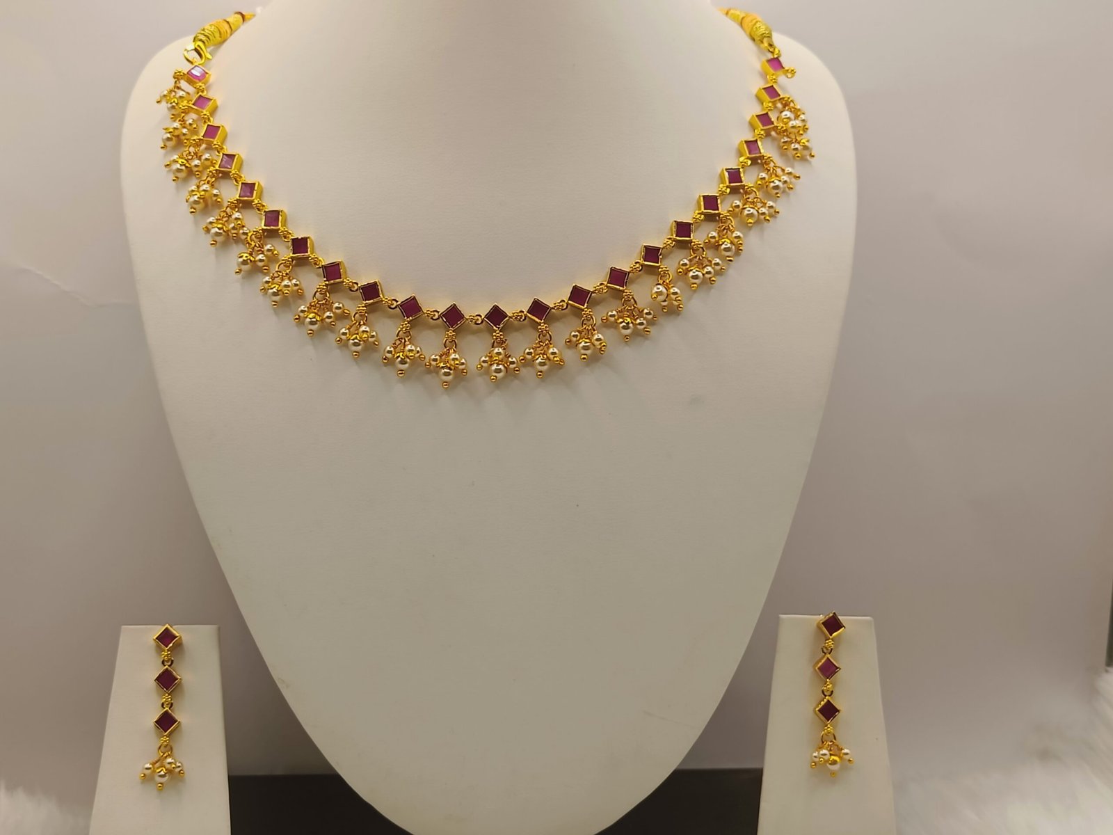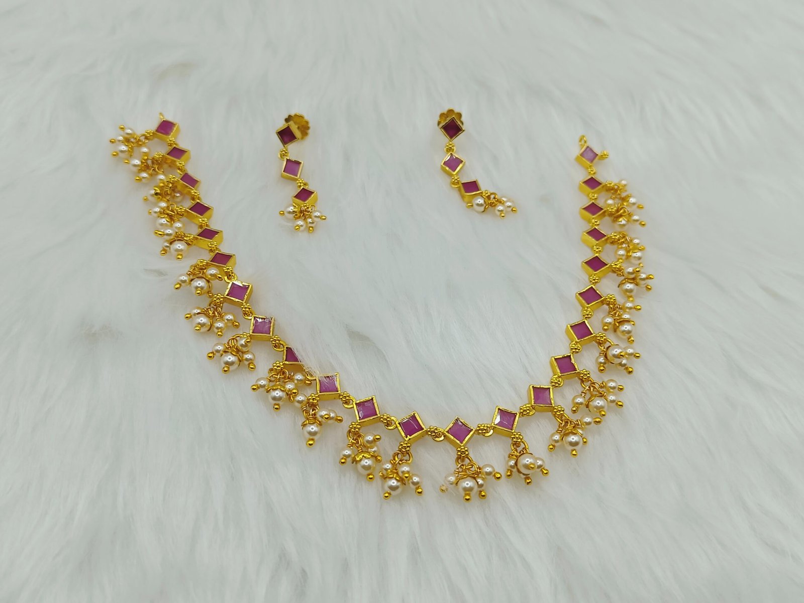 This matching set includes a necklace and earrings, offering a cohesive look that effortlessly ties your ensemble together. The necklace features an intricately designed pendant adorned with a vibrant pink stone, while the earrings showcase delicate studs with matching stones, all designed to capture light beautifully for maximum radiance.