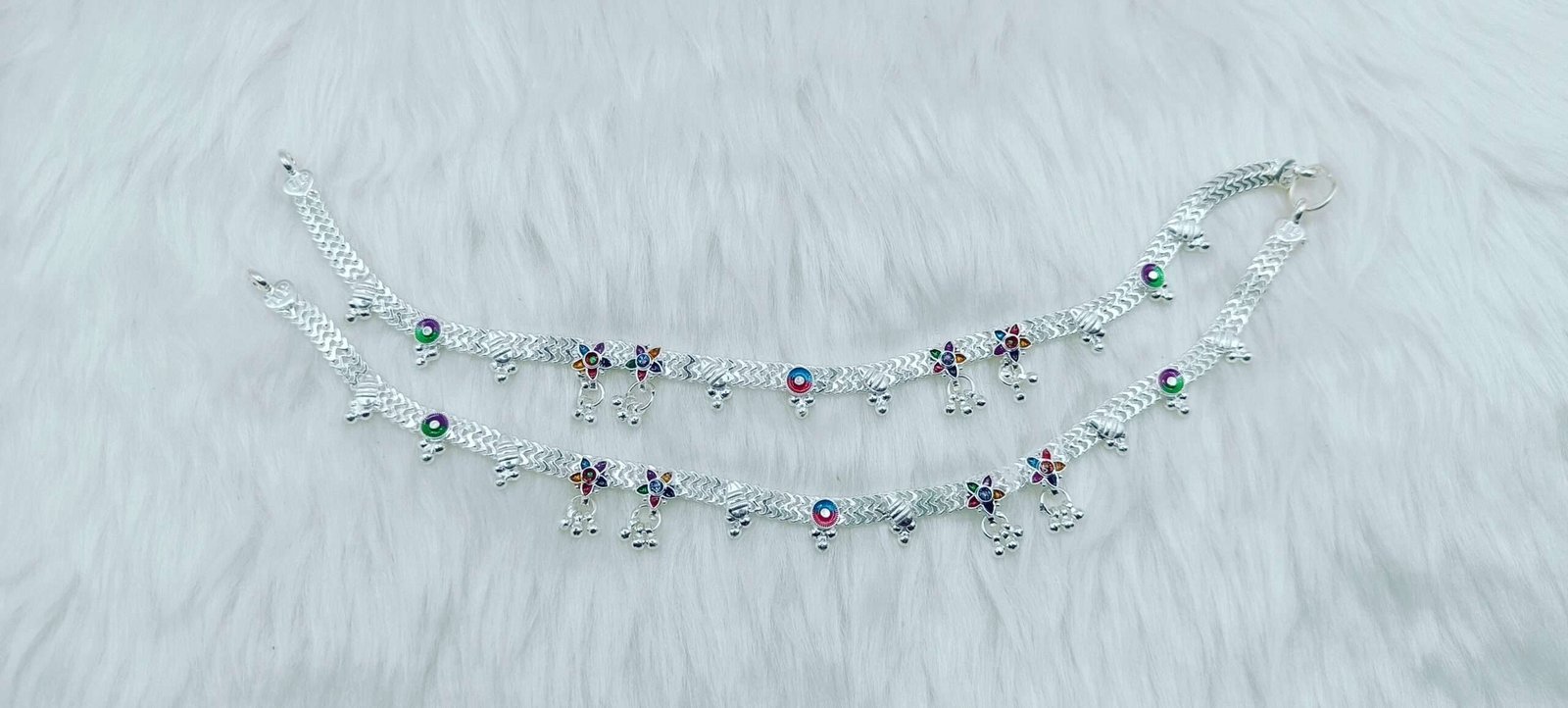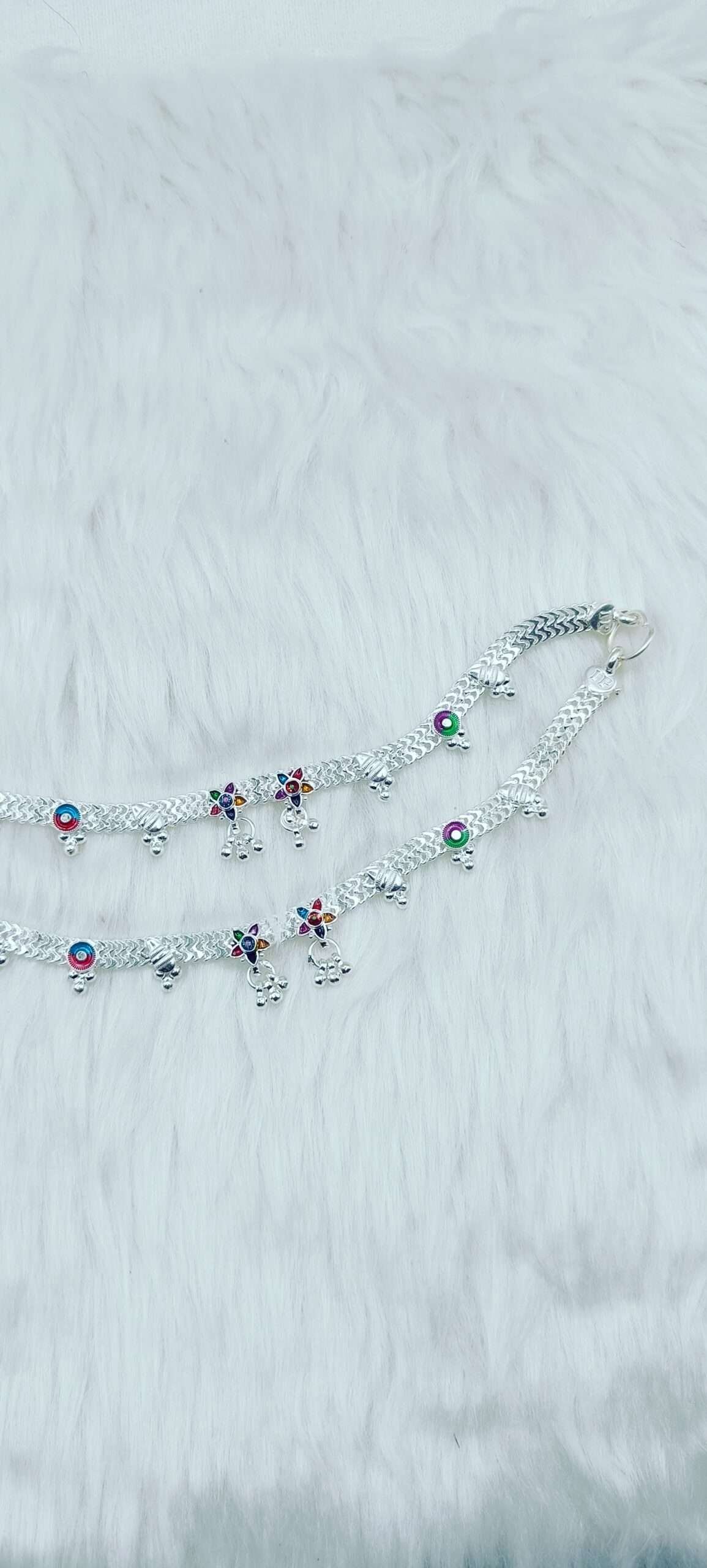 The intricate meena work on the silver payal adds a splash of color and uniqueness, making it a standout accessory for any ethnic attire. Perfect for weddings, festivals, or special occasions, this jewelry piece highlights the skill of artisans who have perfected this craft over generations.