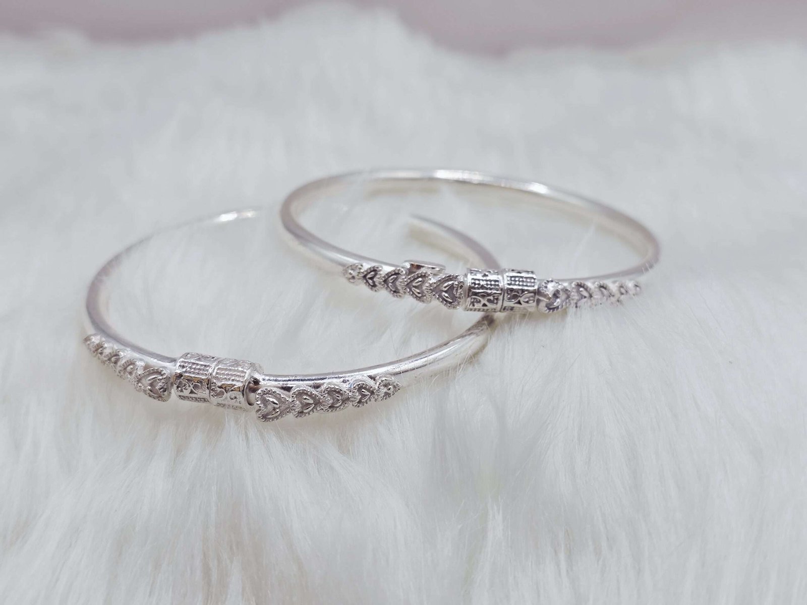 Made from premium-quality sterling silver, the bangles ensure long-lasting durability and a radiant finish that wonât fade. Each piece is polished to perfection, giving it an eye-catching shine that pairs flawlessly with various outfitsâfrom casual to traditional. The lightweight design ensures they are comfortable for all-day wear while maintaining a luxurious appearance. Intricate detailing around the heart motifs adds sophistication, setting these bangles apart from ordinary accessories.